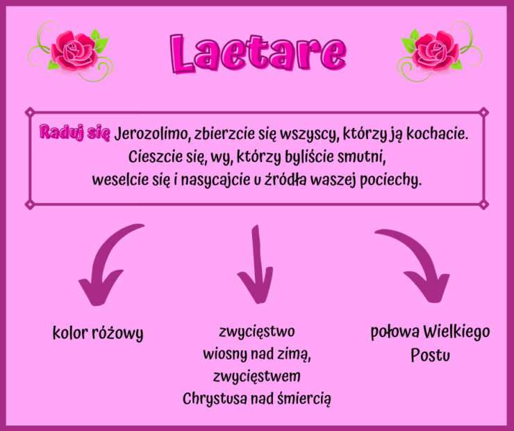IV Niedziela Wielkiego Postu, zwana Niedzielą Lætare, jest wyjątkowym dniem w okresie przygotowania do Wielkanocy. Przypada ona mniej więcej w połowie Wielkiego Postu i wprowadza element radości w czasie refleksji i pokuty. Nazwa pochodzi od pierwszych słów antyfony na wejście: „Lætare, Ierusalem” („Ciesz się, Jerozolimo”), które podkreślają nadzieję i bliskość radości ze Zmartwychwstania Chrystusa.