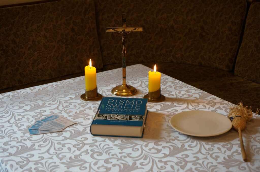 – wodę święconą i kropidło (w przypadku braku wody święconej należy wlać zwykłą wodę i na początku kolędy poprosić księdza o jej poświęcenie),